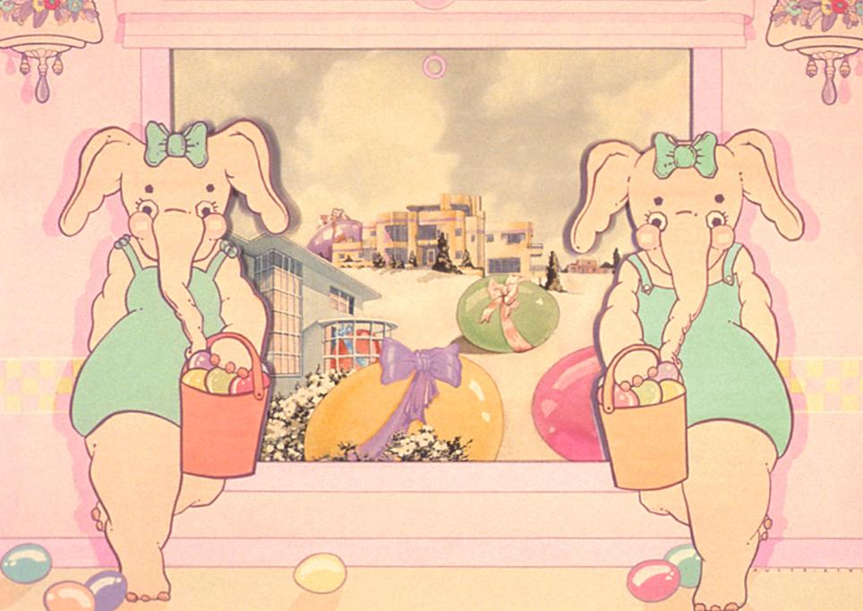 DISGUSTINGLY SWEET ENTRANCE USED TO SET THE TONE! THE GALLERY WAS ALREADY PAINTED BUTTER CREAM CANDY WITH DENTINE GUM COLORED FLOOR. WE PUT UP A TREE WITH VINTAGE STYROFOAM CHICKS AND BUNNIES. VINTAGE SILHOUETTE ANIMALS WERE PAINTED ON THE WALLS GIVING A STORYBOOK FEEL.